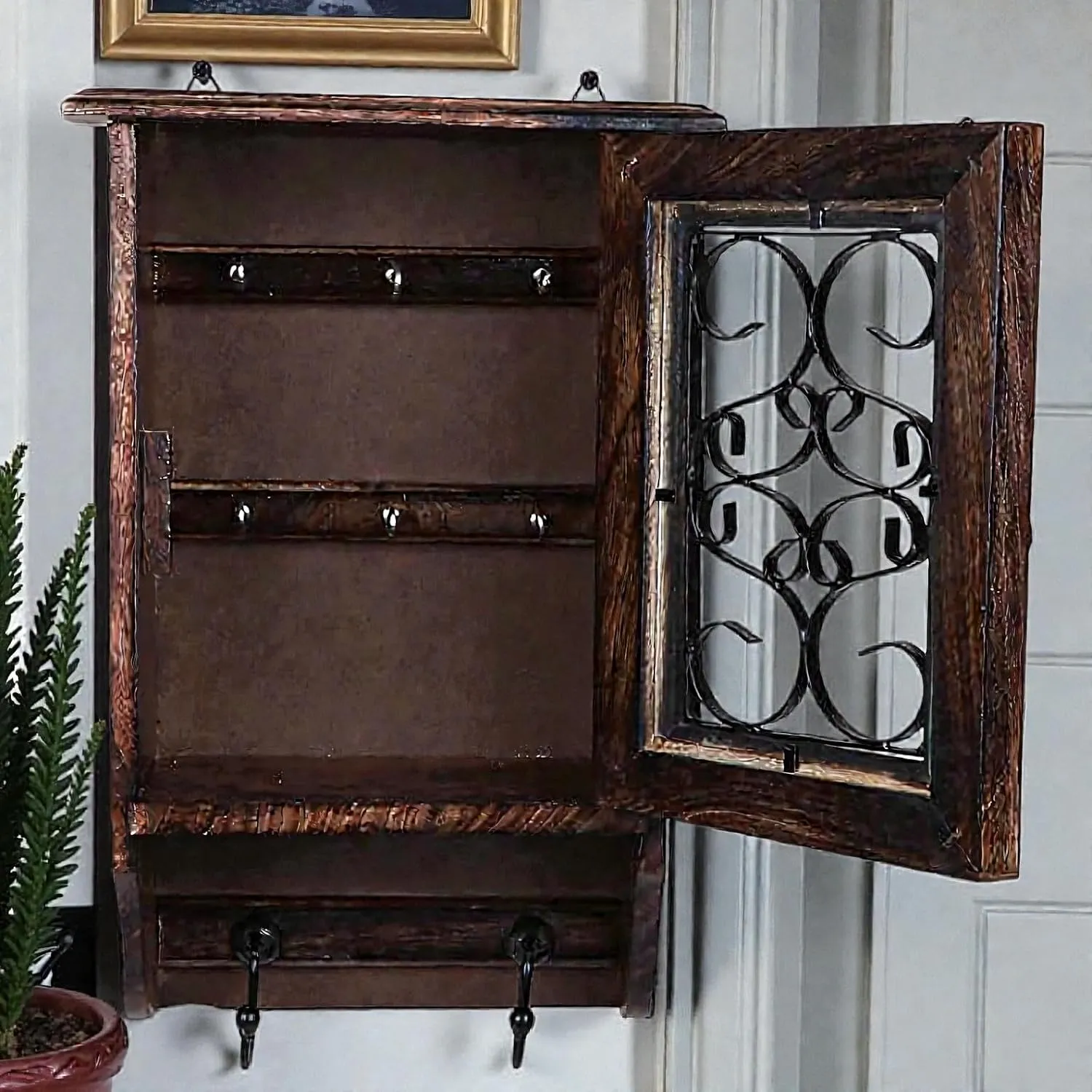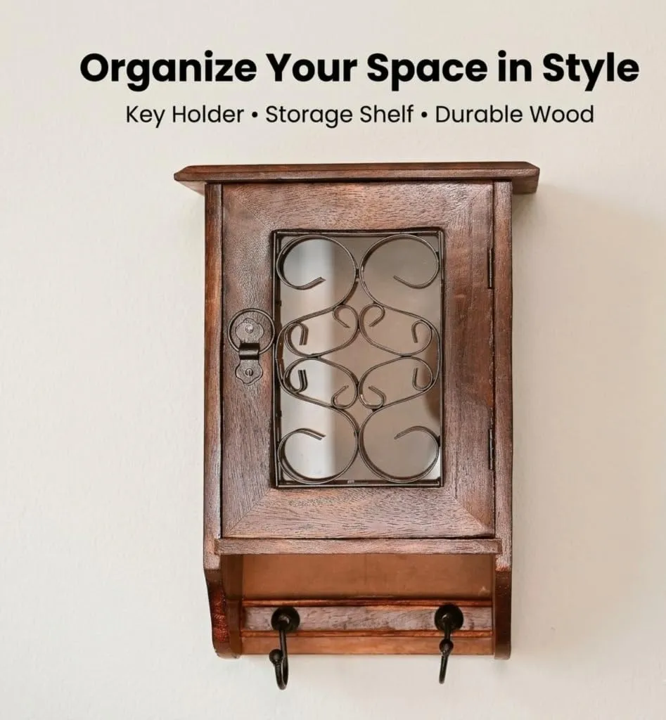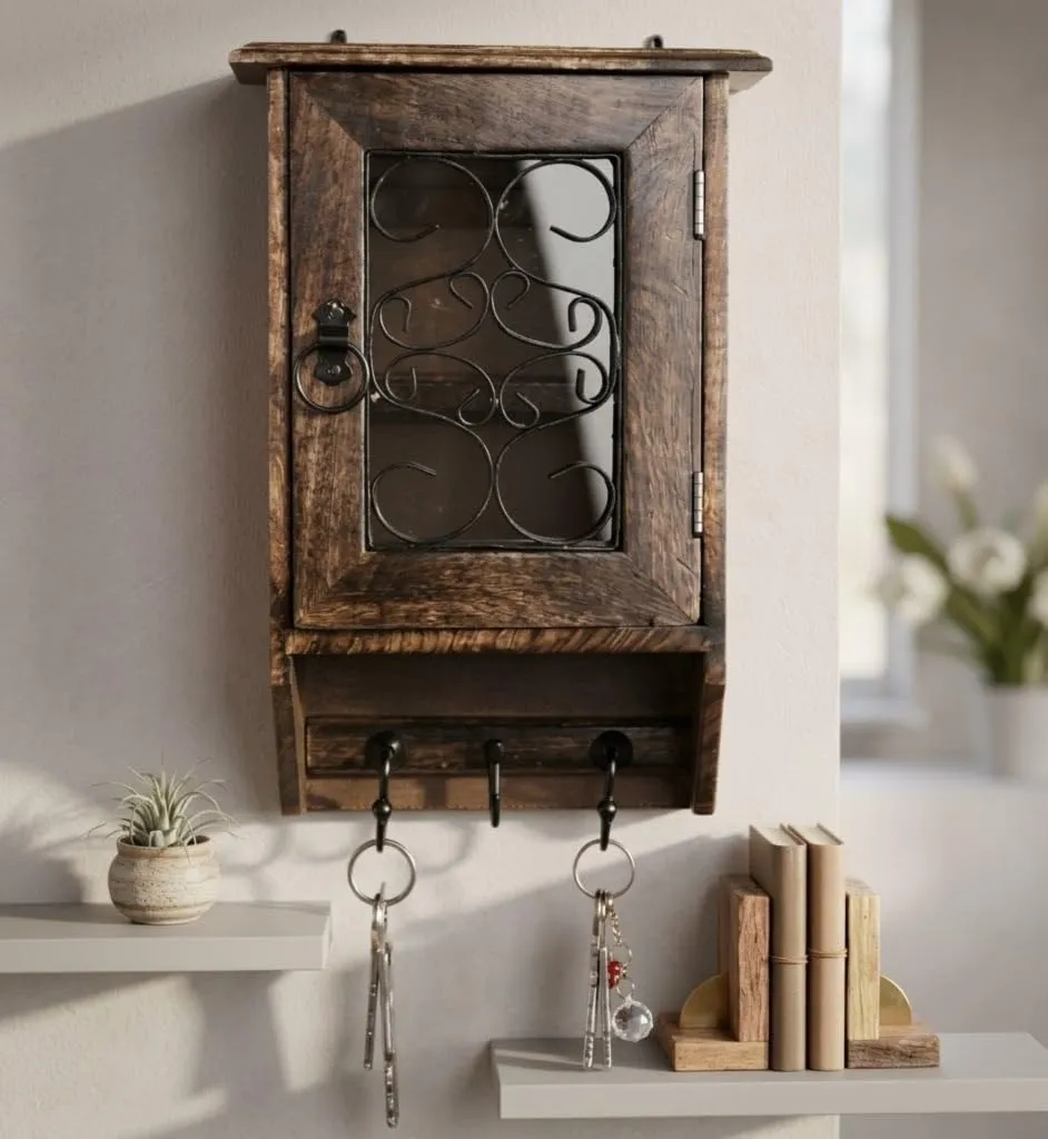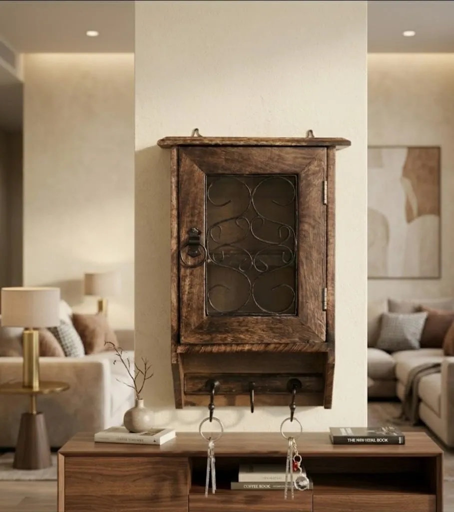 This brown wooden wall mounted key holder cabinet is designed to keep your keys and small essentials organized in a simple and efficient way. Made from durable wooden material it offers strong and reliable support for everyday use. The wall mounted design helps you save space by keeping your keys in one fixed place without using floor space making it ideal for modern homes. It is perfect for organizing keys and small accessories ensuring that you can find them quickly whenever needed. The compact structure makes it suitable for living room entryway hallway or office providing flexible usage options. The rich brown finish adds a warm and elegant look that blends well with different interior styles. This cabinet is designed to help you stay organized by reducing clutter and keeping your essentials in one place. The sturdy construction ensures durability while the smooth surface allows easy cleaning helping you maintain a neat and tidy environment. Lightweight and easy to install it requires minimal effort to set up so you can start using it right away. Whether you want to organize your keys or add a functional decor piece to your wall this wooden key holder cabinet offers practicality durability and simple design to improve your daily routine and keep your space well arranged