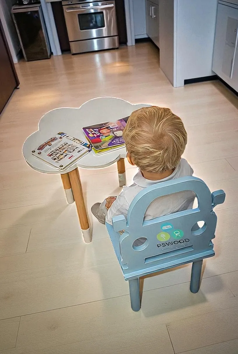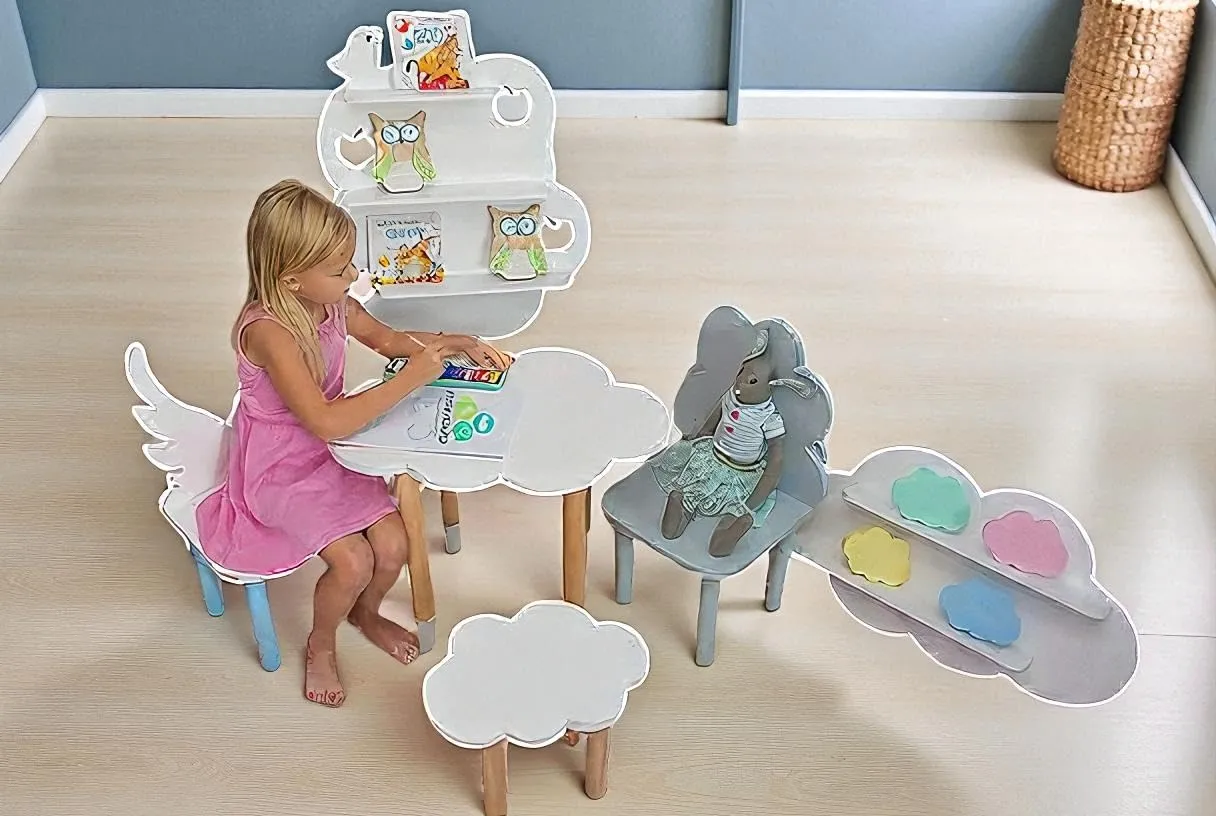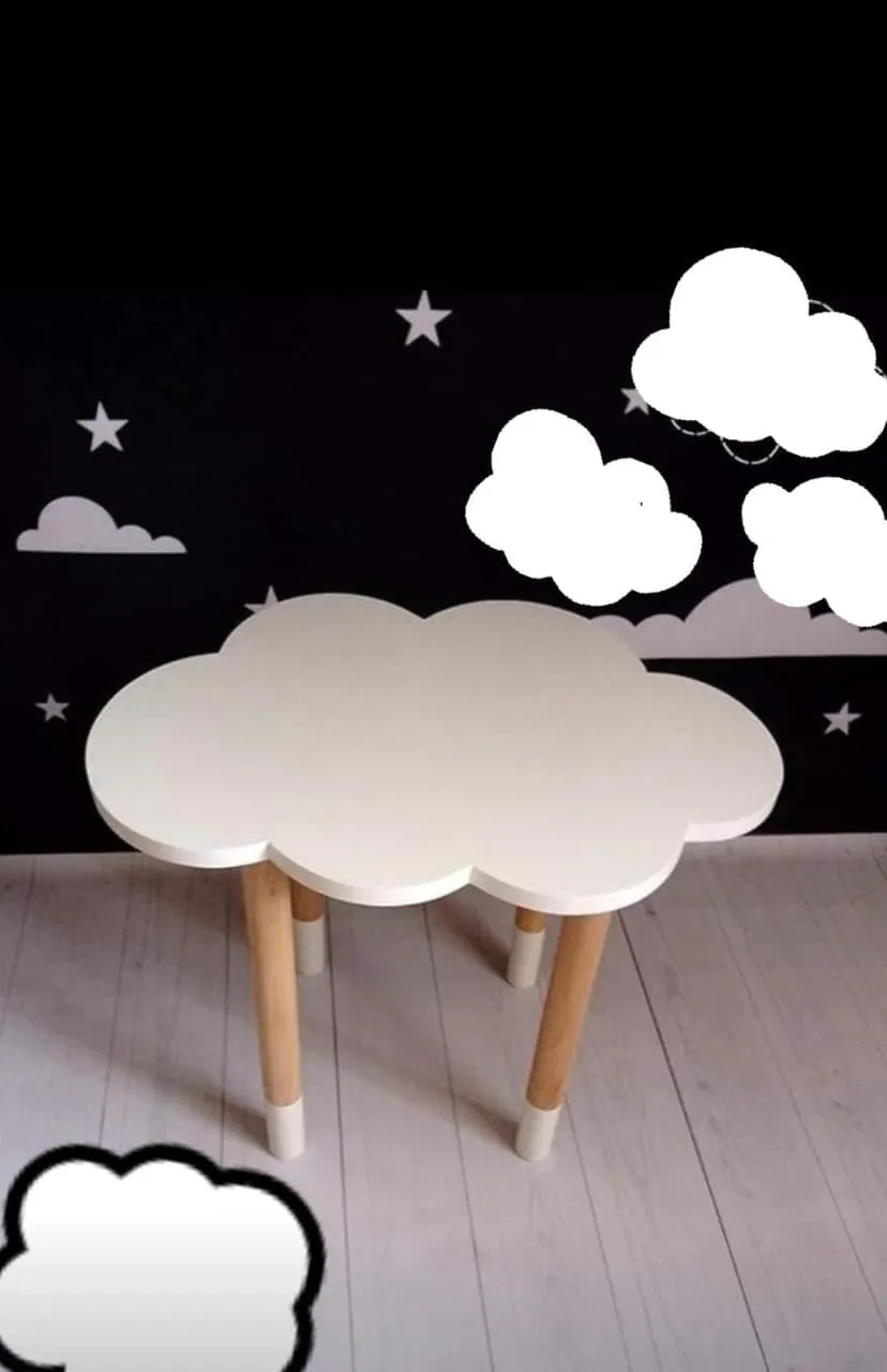Create a fun and comfortable learning space for your child with this cloud shape kids wooden table and chair set. Designed to combine creativity and functionality this set is made from durable wood that ensures long lasting use and reliable support. The unique cloud shaped table adds a playful touch that encourages children to spend more time studying drawing and engaging in activities.