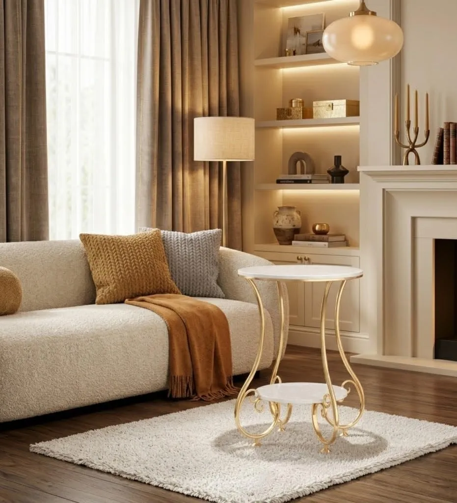 This coffee table for living room combines a durable wooden surface with a strong iron frame to create a stylish, functional centerpiece for your home. The high-quality materials ensure long-lasting durability and stable support, making it ideal for daily use. Its spacious surface offers ample room for drinks, snacks, books, decorative items, and electronics, helping keep your living area organized and clutter-free. The elegant combination of white wood and golden iron accents adds a modern and luxurious touch, blending seamlessly with contemporary, minimalist, or classic interior styles. Designed for multipurpose use, this table can serve as a coffee table, display surface, or workspace for small tasks, providing versatility in any room. The sturdy frame ensures stability, preventing wobbling or tipping even when fully loaded. Lightweight and easy to move, it allows flexible placement throughout your living room or other spaces as needed. The smooth wooden surface is easy to clean, maintaining a neat and polished appearance with minimal effort. Suitable for living rooms, lounges, bedrooms, or home offices, it enhances both functionality and style. Minimal assembly is required, enabling quick setup and immediate use. This wooden and iron coffee table combines durability, elegance, and practicality, making it a valuable addition to any modern home seeking both style and convenience.