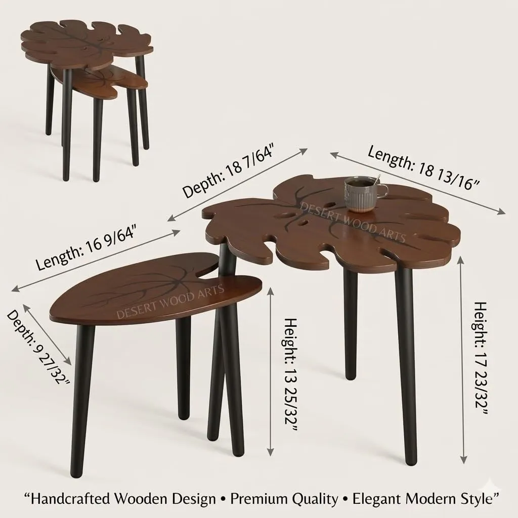 Upgrade your home with this wooden coffee table set of 2 foldable leaf shape tables designed for both style and functionality. Made from natural wood, these tables bring a warm and elegant touch to your living space while offering reliable durability for everyday use. The unique leaf shaped design adds a modern and decorative element that easily blends with different interior styles.