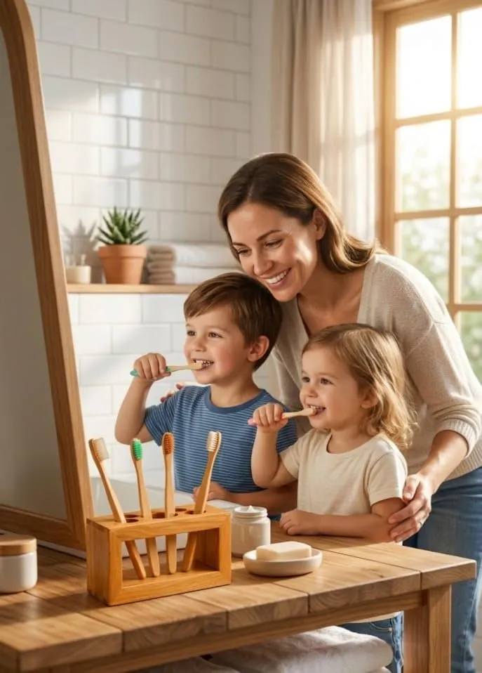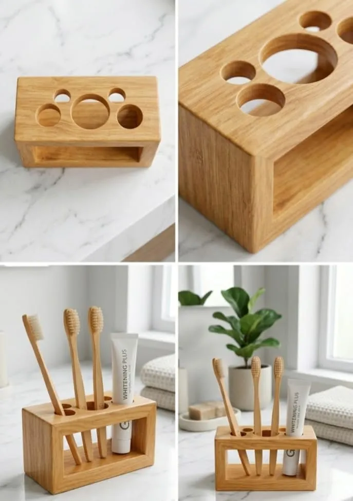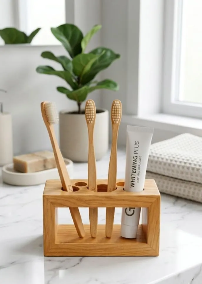 This wooden toothbrush holders set is a practical and simple solution for organizing your bathroom essentials. Made from natural wood it provides a sturdy and durable structure that supports everyday use while maintaining a clean and minimal look. The natural finish adds warmth to your bathroom space making it suitable for different interior styles. Designed to keep toothbrushes neatly arranged this holder helps maintain hygiene and prevents clutter around your sink area. Its compact size makes it easy to place on bathroom counters or shelves without taking up too much space. The holder can also be used to store toothpaste razors and other small accessories offering versatility in daily use. Its stable base ensures that it remains in place during use preventing tipping or movement. The smooth wooden surface makes cleaning easy requiring only a quick wipe to maintain cleanliness and hygiene. Lightweight and easy to move this holder can be repositioned as needed making it convenient for different setups. Whether used at home in shared bathrooms or in guest spaces this toothbrush holder helps keep your essentials organized and accessible. It also enhances the overall appearance of your bathroom by adding a natural touch. This holder is a useful addition for anyone looking to improve organization cleanliness and convenience in their daily routine
